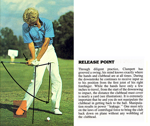 Release Point.Monitoring (sensing and regulating) educated hands by means of the clubhead "feel" against the #3 pressure point (first joint of the right forefinger) provides the total control that can keep the clubshaft pointing precisely at the plane line (lower edge of the inclined plane) this close to the low point of their path without allowing the club to fly out prematurely. The hands have only a few inches to travel while the clubhead travel will be a matter of feet. This speed gives centrifugal force the power to pull clubshaft and clubhead in-line imparting a true horizontal hinging motion (like a swinging door) so there will be no clubface wobble during impact that lets the established compression leak away. Only this hinging can produce the consistent power of true rhythm.